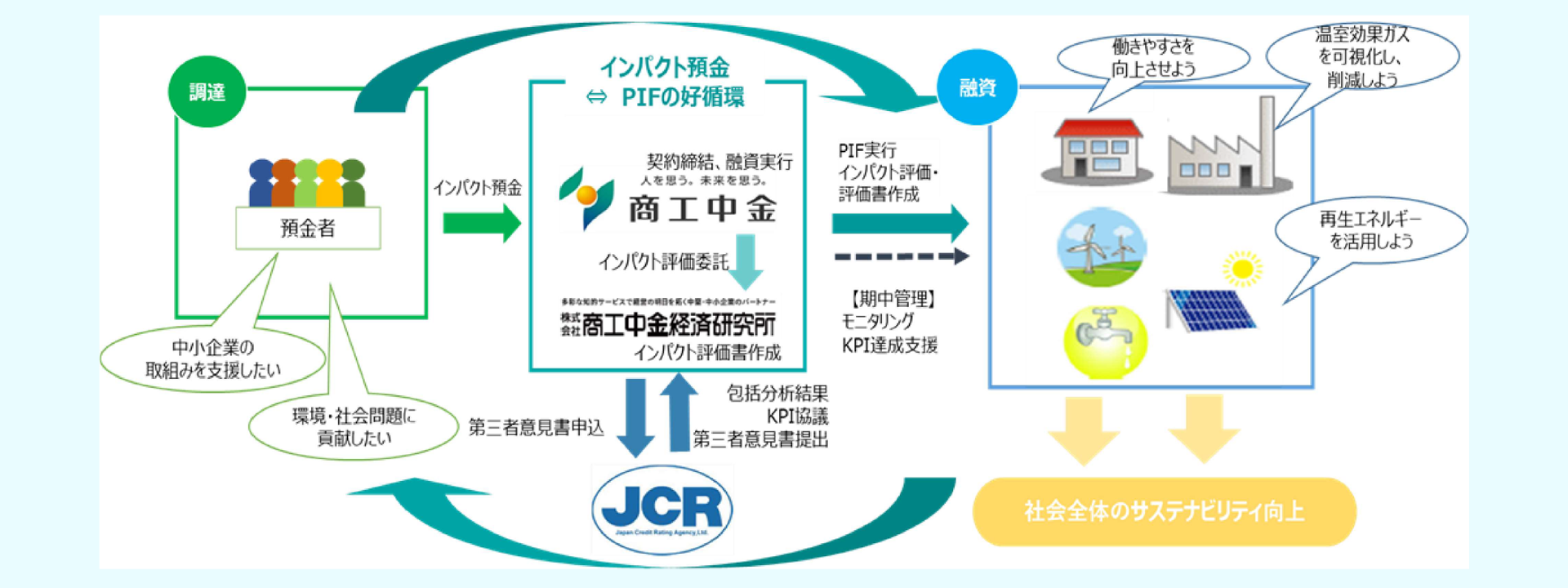 商工組合中央金庫の「インパクト預金」はPIF(ポジティブ・インパクト・ファイナンス)の原資になるものです。PIFとは、金融機関が環境や社会などの課題に対処し、持続可能な発展を促進するために資金を提供する取り組みです。PIFは融資先の企業の活動が環境・社会・経済に与える影響を分析し、ポジティブな影響を増やし、ネガティブな影響を減らすことを目指しています。これにより、企業の「社会的価値」や「経済的価値」、「働き手の幸せ」を総合的に高めていく仕組みとなっていることが特徴です。このPIFへの取り組み強化のため導入されたのが「インパクト預金」であり、商工中金では「インパクト預金」から集めたお金をPIFの条件に合致する融資に使います。「インパクト預金」は社会や環境への良い影響を持つ事業やプロジェクトに資金を提供して、持続可能な社会の発展をサポートしています。