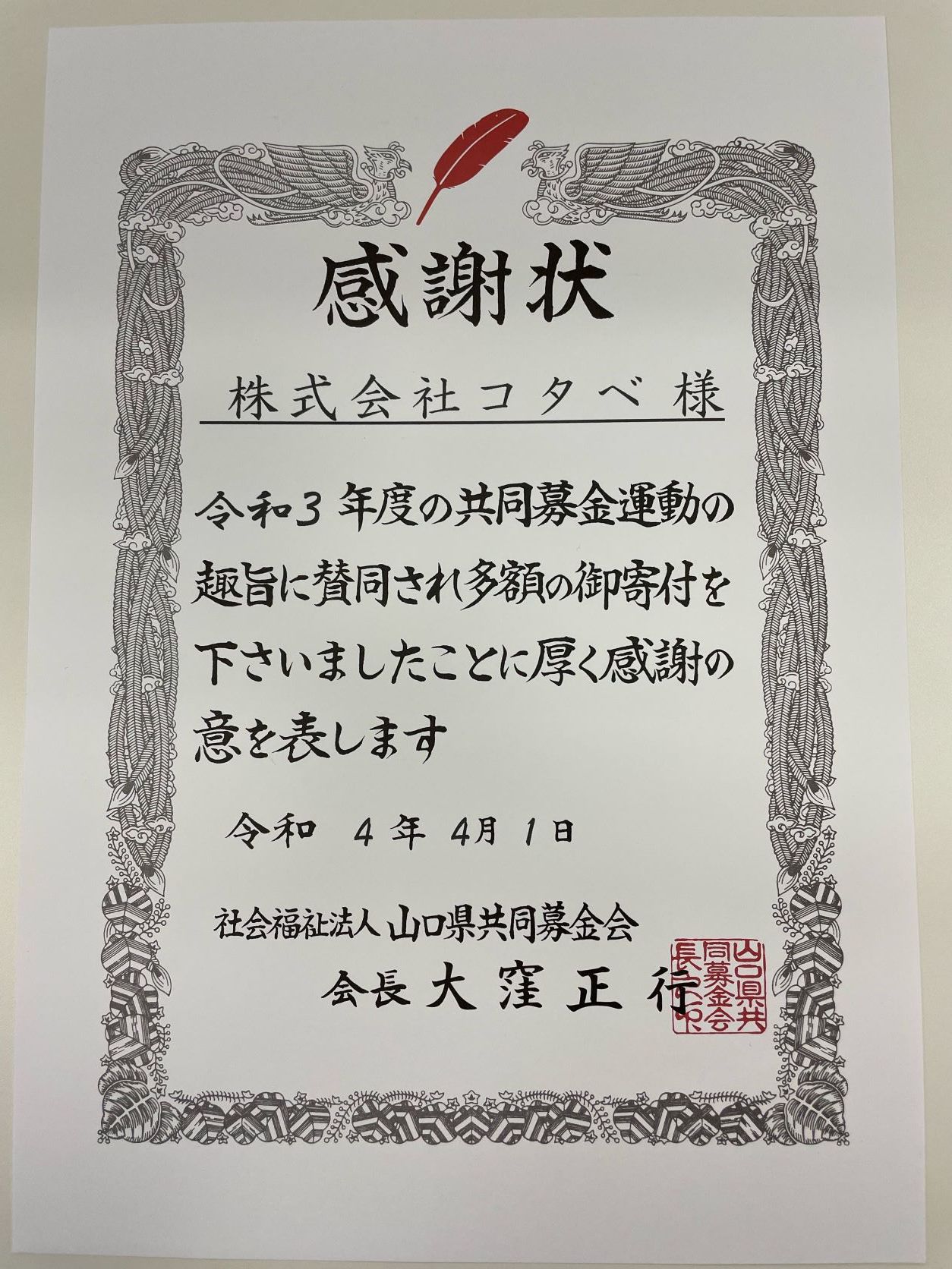 株式会社コタベは「 令和3年度 赤い羽根共同募金運動 」につきまして、社会福祉法人山口県共同募金会様より評価され、令和4年4年1日に「山口県共同募金会 感謝状」を授与いたしました。