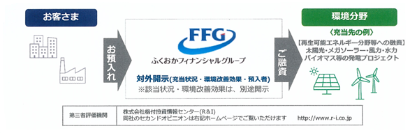 FFGグリーン預金は、集めた資金を「FFGグリーン預金フレームワーク」に基づき、ESG(環境・社会・ガバナンス)のうち、環境分野、特に再生可能エネルギー分野向けの融資に充当することを目的とした預金商品です。