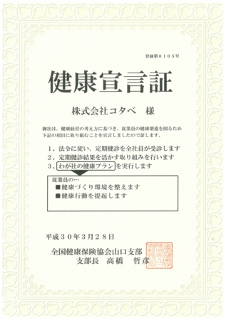 株式会社コタベでは、やまぐち健康経営企業認定制度に沿い平成30年3月29日付で「健康宣言」を致しました。