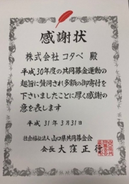 株式会社コタベでは、少額ではございますが、平成30年度の共同募金運動に対する寄付活動が評価され、この度、社会福祉法人山口県共同募金会より「感謝状」を授与されました。